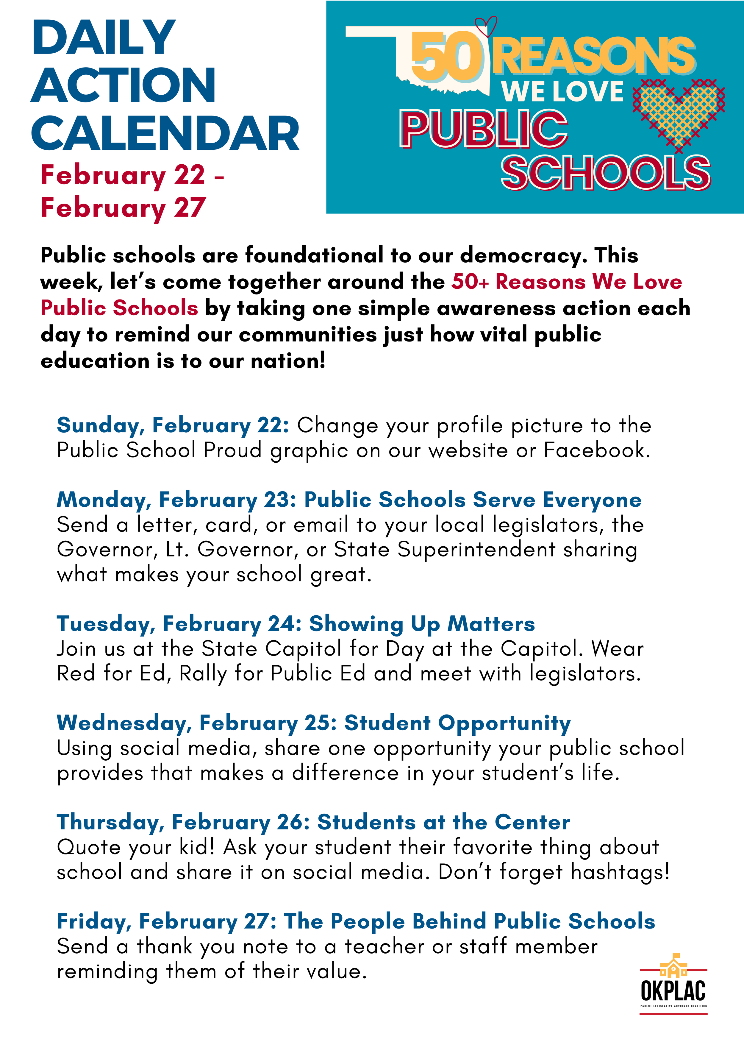 You can join us! | Start by updating your social media profile picture with the #PublicSchoolProud frame and downloading the toolkit that fits you best. Follow your local PLAC and/or OKPLAC for daily action items and shareable content to post on your personal page.